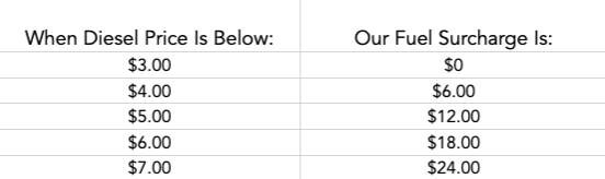 This table illustrates the fuel surcharge associated with diesel pricing.